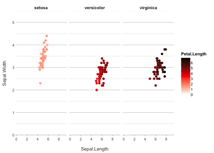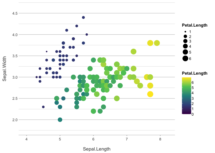 plot2(Sepal.Length, Sepal.Width, Petal.Length, Species,