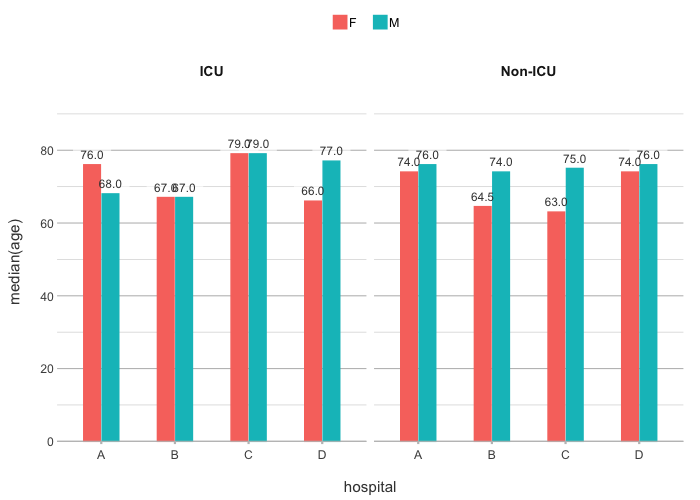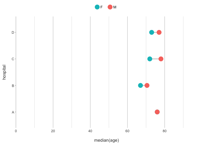 plot2(hospital, median(age), gender, type = "dumbbell")