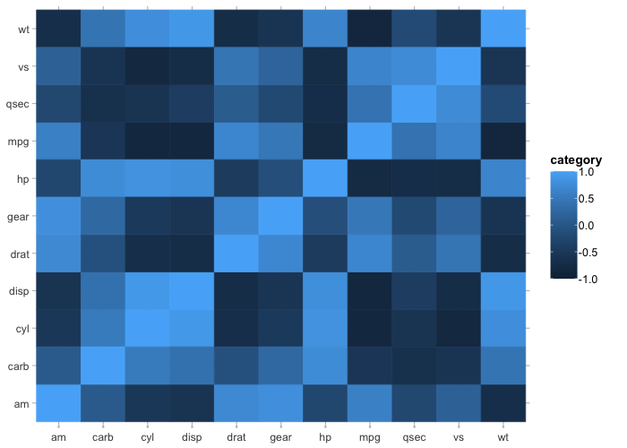 #> drat 0.6811719 -0.6999381 -0.7102139 -0.4487591 1.0000000 -0.7124406 0.09120476 0.4402785 0.7127111 0.6996101 -0.0907898