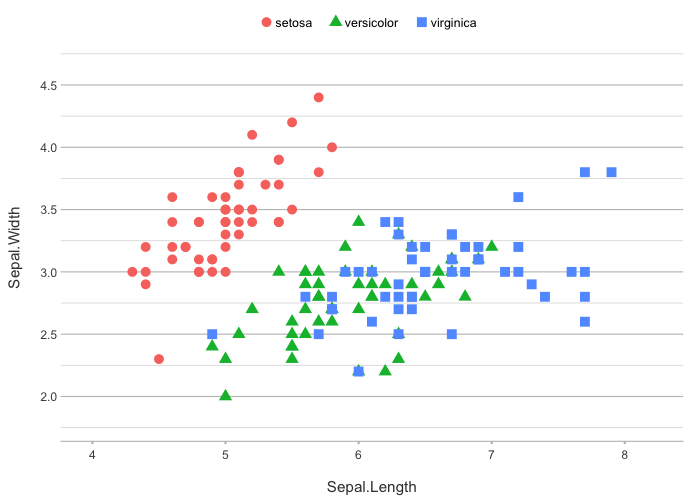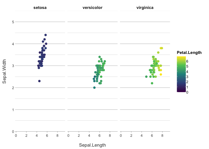 plot2(Sepal.Length, Sepal.Width, Petal.Length, Species)