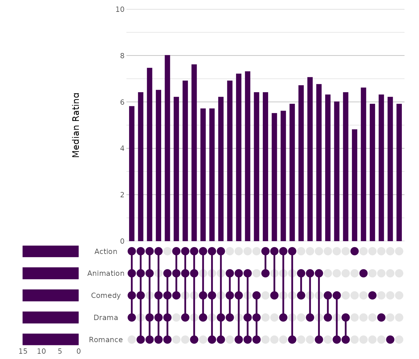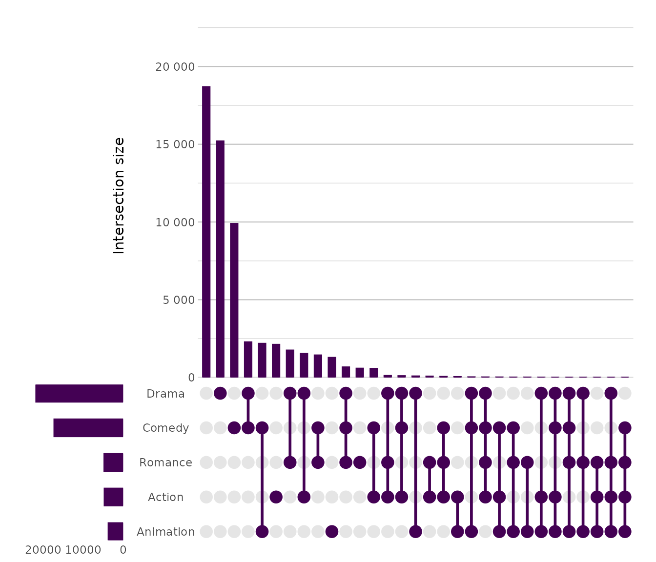 plot2(x = c(Action, Animation, Comedy, Drama, Romance),