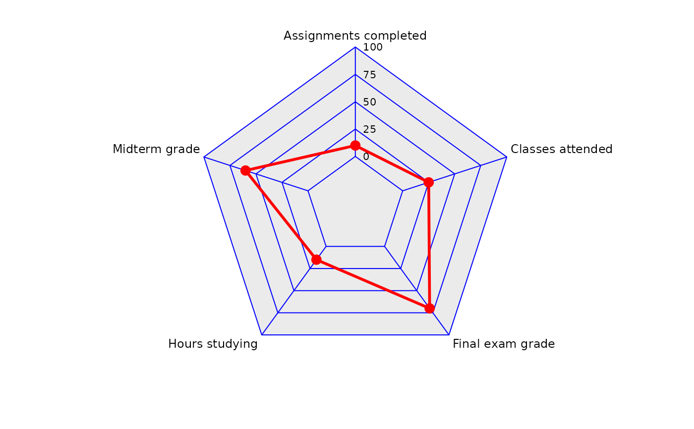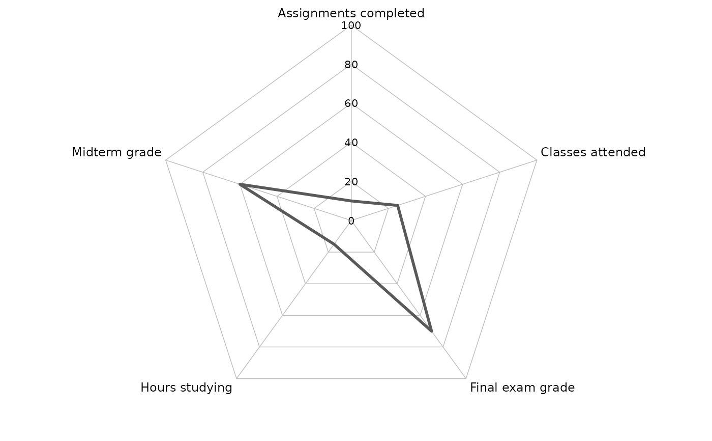 Typical usage is to map a discrete variable (categories) to x (theta) and a continuous variable (scores) to y (radius), then draw a polygon with geom_polygon().